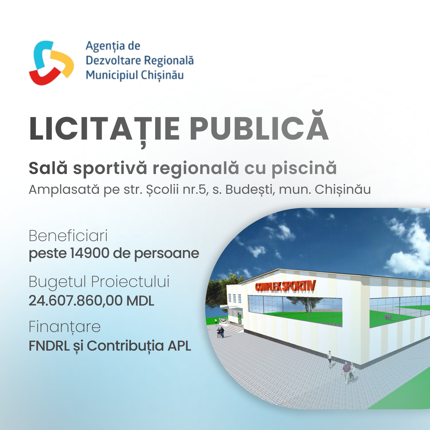 Agenția de Dezvoltare Regională Mun. Chișinău lansează procedura de licitație publică pentru contractarea lucrărilor aferente proiectului „Sala sportivă regională cu piscină”, ce va fi amplasat pe str. Școlii, nr. 5, în satul Budești, municipiul Chișinău. Proiectul are drept scop sporirea atractivității turistice și îmbunătățirea calității vieții locuitorilor din satele Cruzești, Budești, Tohatin și Bălțața, prin amenajarea unor spații moderne de agrement, promovarea unui mod de viață sănătos și dezvoltarea infrastructurii locale. Mai multe detalii pe: https://achizitii.md/ro/public/tender/21500137/ |